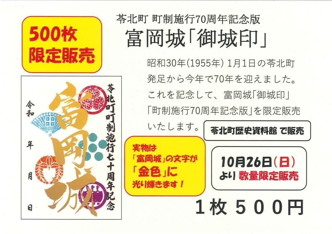 これを記念して「富岡城 御城印」町制施行70周年記念版を、令和7年10月26日(日)午前10時より苓北町歴史資料館において、500枚限定で販売いたします。