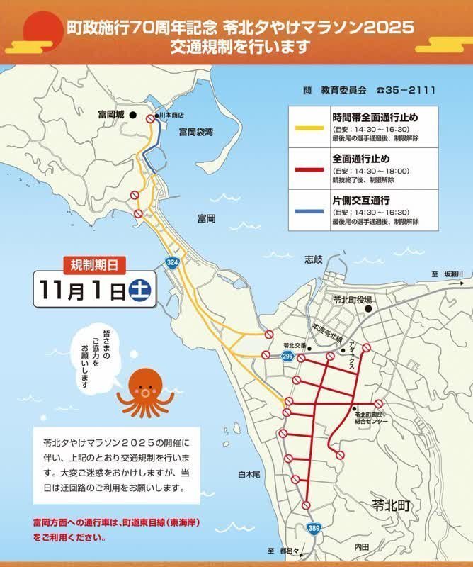 11月1日(土)に開催される苓北夕やけマラソン大会では、交通規制を実施します。