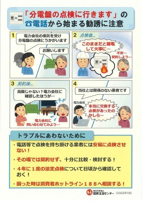 【詐欺に注意】ブレーカーや分電盤の点検の電話について 最終更新日:2025年11月13日 印刷 商工観光課からお知らせします。電話で「ブレーカーや分電盤の点検」を持ち掛けて訪問し、高額な交換費用を請求されるという被害が国民生活センターに報告されています。町内でも「同じ内容で電話がかかってきた」という連絡もありましたので、トラブルの未然防止のためにも、「ブレーカーや分電盤の点検をしませんか」から始まる電話にご注意ください。
