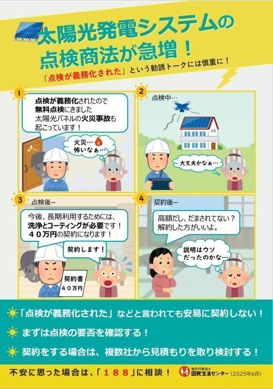 【詐欺に注意】太陽光発電システムの点検商法が急増! 最終更新日:2025年12月4日 印刷 商工観光課からお知らせします。 電話で「太陽光発電システムの点検」を持ち掛けて訪問し、高額な点検費用を請求されるという被害が国民生活センターに報告されています。 町内でも「同じ内容で電話がかかってきた」という連絡もありましたので、トラブルの未然防止のためにも、「太陽光発電システムの点検をしませんか」から始まる電話にご注意ください。